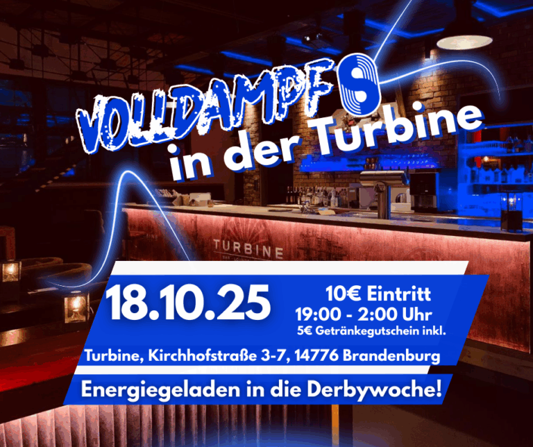 Am Samstag den 18.10.25 öffnen wir ab 18:30 Uhr die Türen der Turbine in der Kirchhofstraße 3–7 in Brandenburg und bringen gemeinsam die Stimmung zum Kochen