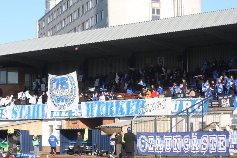 Stimmungsvoll ging es in die Partie, die Fans ließen den Verein zum 75. Geburtstag „Hoch leben“, die BSG Stahl wurde im November 1950 gegründet. Mit einer Choreografie auf der Haupttribüne wurden die Spieler begrüßt, nun lag es an ihnen mit einem Sieg den festlichen Rahmen zu füllen. Mit starkem Anlaufen drängten sie die Werderaner in ihre Hälfte. In der 8. Minute setzte sich Jean-Pierre Dellerue auf der rechten Seite durch, seine Flanke vor das Gästetor verwertete Sebastian Hoyer per Kopf. Und die Platzherren blieben dran, beschäftigten die Viktoria-Defensive, wenngleich nicht jeder Angriff Gefahr ausstrahlte.